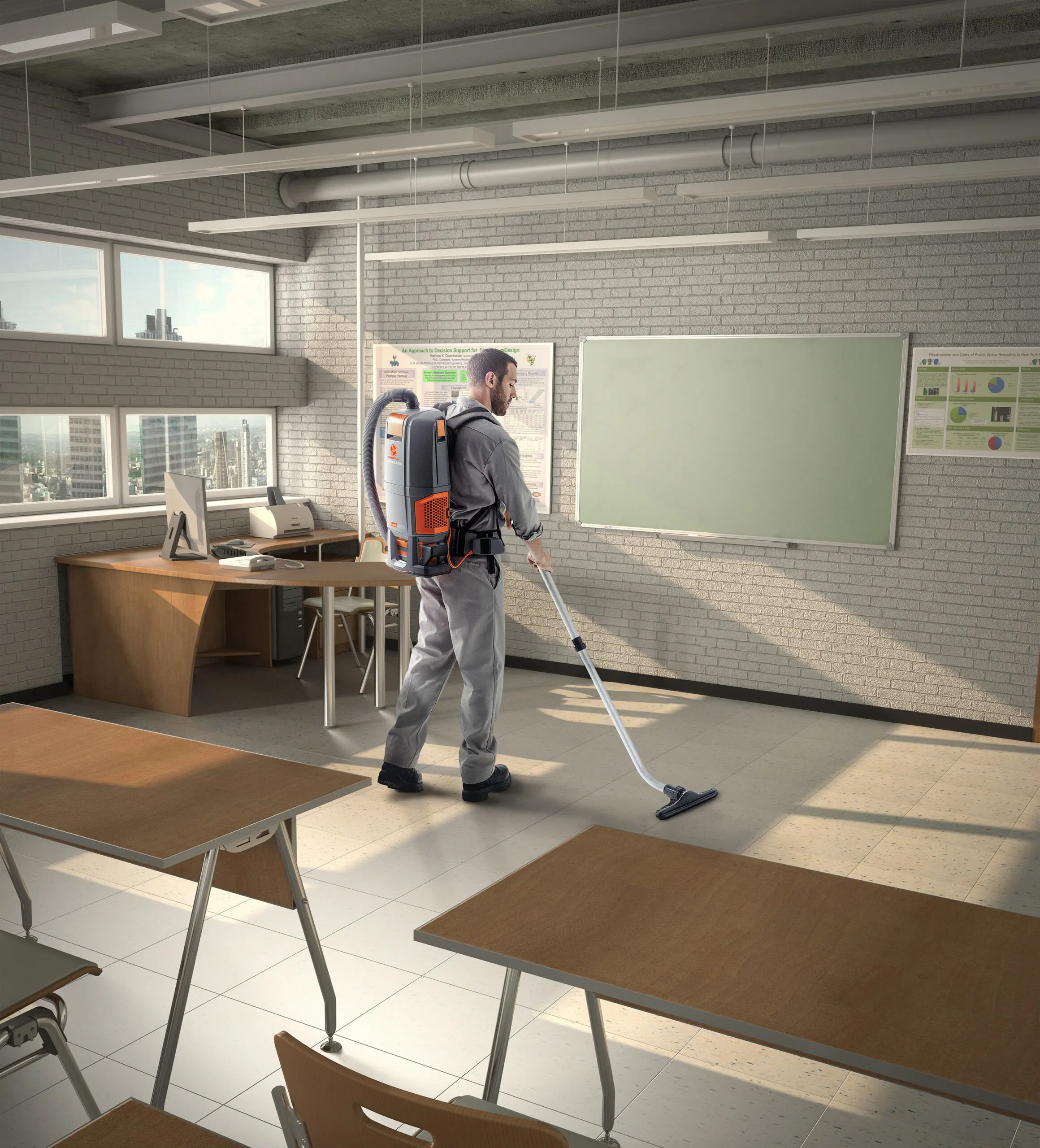 2D integrated and retouched for TTI. Scene is 3D. Man and vacuum are 2D.